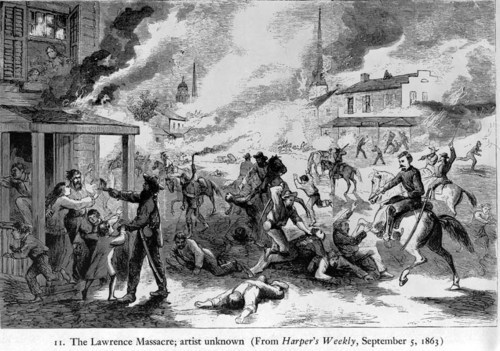 Part of the movie was about the infamous “Lawrence Massacre,” which occurred 150 years ago tomorrow, on August 21, 1863. That event, also known as “Quantrill’s Raid,” was a guerrilla attack led by William Quantrill. Between 150 and 200 men and boys were killed in that atrocious raid. Image